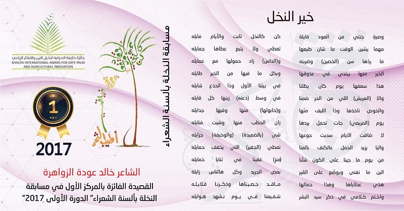 الشاعر خالد عودة الزواهرةالقصيدة الفائزة بالمركز الأول في مسابقة "النخلة بألسنة الشعراء" الدورة الأولى 2017